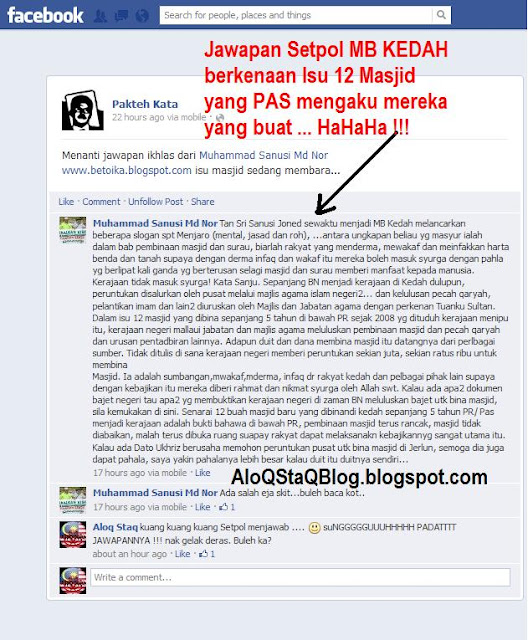Berikut adalah print screen jawapan Setpol MB Kedah (Saudara Sanusi Md Nor) yang Admin AloQStaQBlog capture dari page FB sahabat Admin AloQStaQBlog, iaitu FB Pakteh (betoika.blogspot.com).